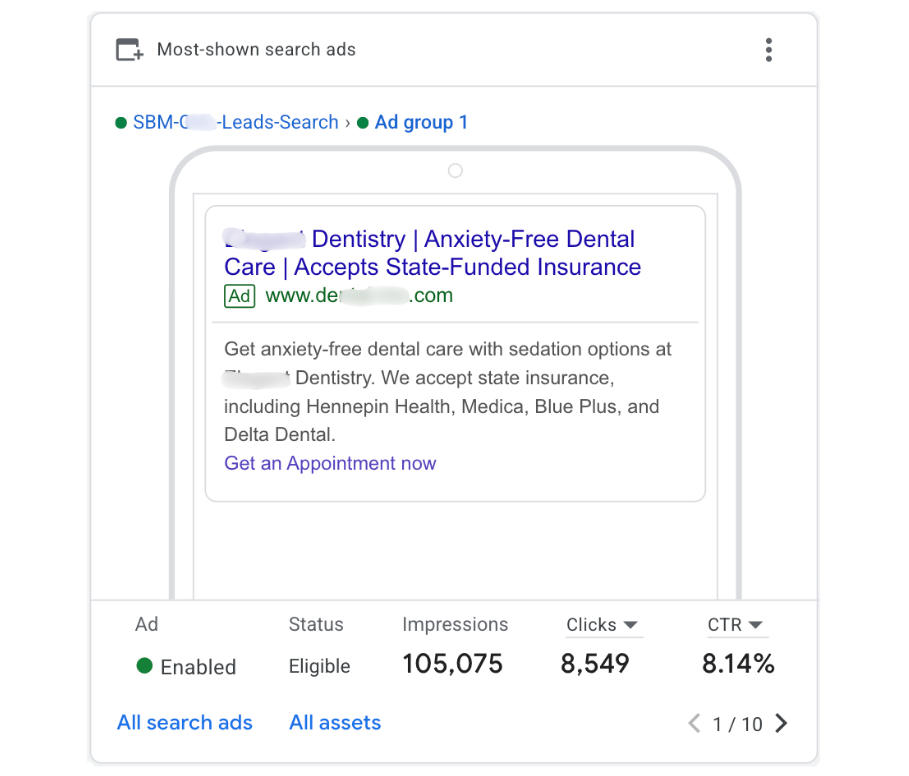 This means nearly 1 out of every 12 people who see our ads takes action, far higher than typical dental advertising. It shows that our ads deliver the right message to the right patients at the exact moment they’re searching for care.