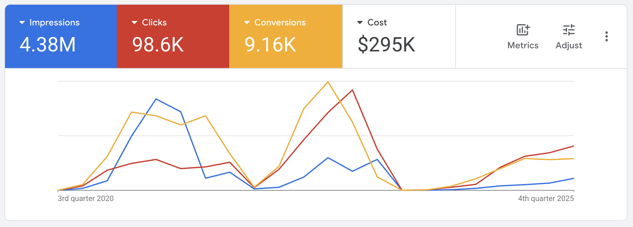Over 4.3 million impressions, 98,000+ clicks, and 9,000+ conversions generated through well-structured Google Ads campaigns built for intent, efficiency, and growth.